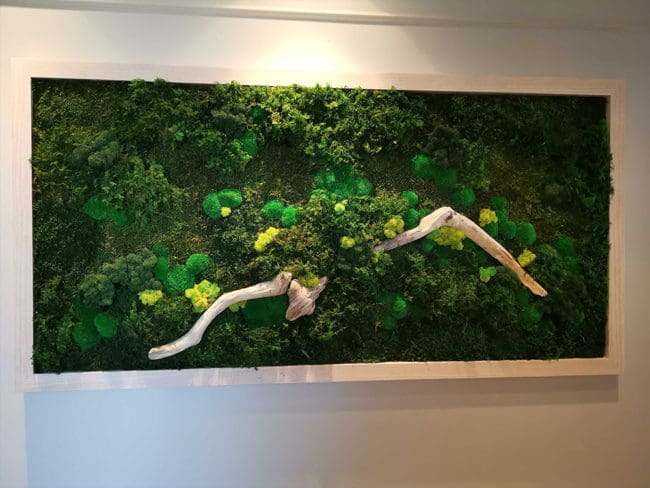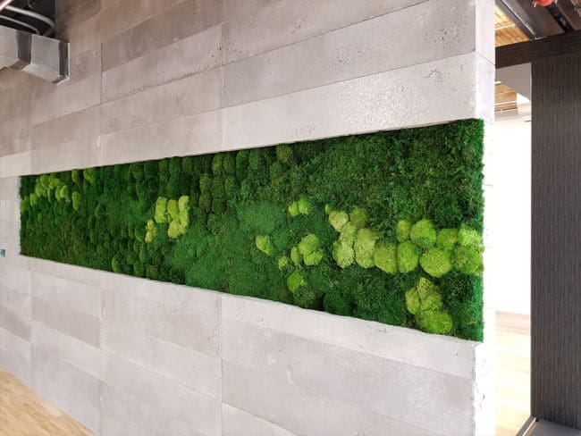 NOM DU PROJET :Tompkins Insurance Services (https://tompkinsinsurance.com/) DESIGNERByNature et T+ Studio (https://tplus.studio/) LIEU :Toronto, ON SYSTÈME(S) BIOPHILIQUE(S) :Mousses stabilisées (mousse dichrane, mousse boule vert pomme, mousse fougère mousse plate vert…