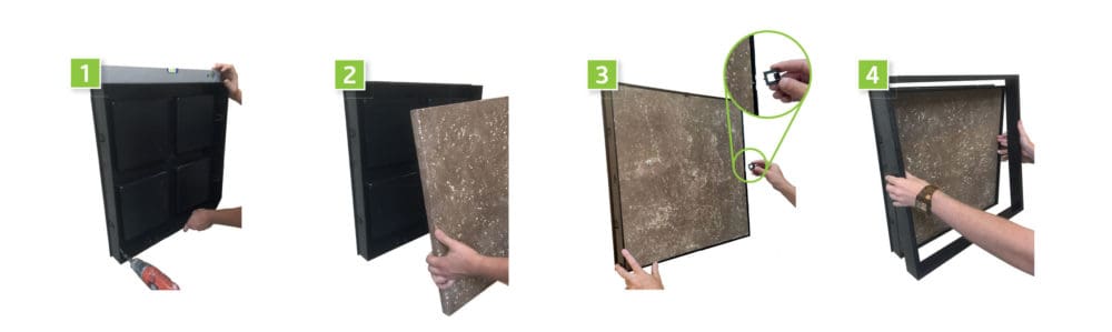 The BioMontage system is an easy to install, two-piece frame that holds a Moss, Folia or preserved panel for a clean & natural detail built into your space. Inserts can easily be changed to create a new look.
